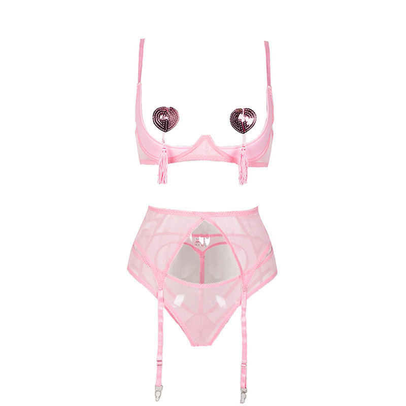 • Intensify your seductive appeal with our Sexy Open-cup Lingerie Set with Nipple Pasties in a delightful shade of pink.