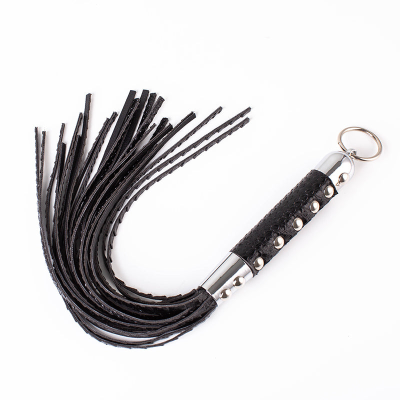 • The metal ring on the handle creates impactful sound upon impact and allows for easy storage. The textured lychee pattern handle combined with the metal studs activates both tactile and visual sensations. The faux barbs elevate the sensory experience. The flogger is made of soft and delicate PU material, providing a gentle and refined touch.
